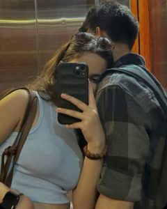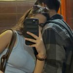 Una pareja se toma una selfie frente al espejo de un elevador, mostrando cercanía y espontaneidad en un momento cotidiano.