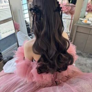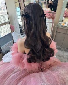 Este peinado permite lucir el cabello suelto con ondas delicadas, complementado con tiaras, diademas o aplicaciones discretas, logrando un estilo glamuroso y romántico ideal para la celebración