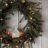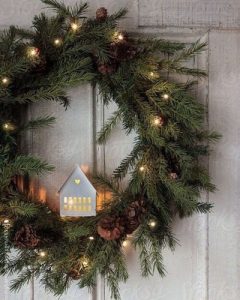 coronaa navideña decorada con una casita en medio
