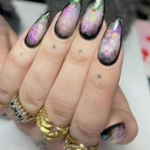 Uñas de bruja con efecto mármol en colores claros y bordes en color negro