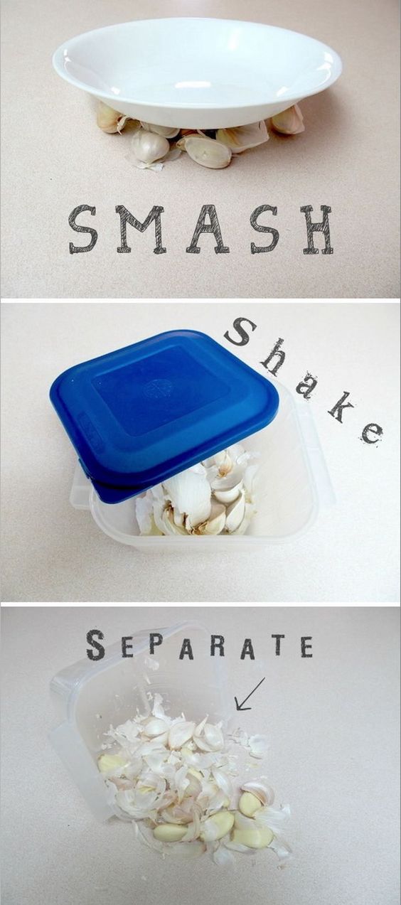 - Para pelar los ajos mucho más fácilmente intenta primero aplastarlos con un plato, luego meterlos a un tupper, agita y finalmente separa.