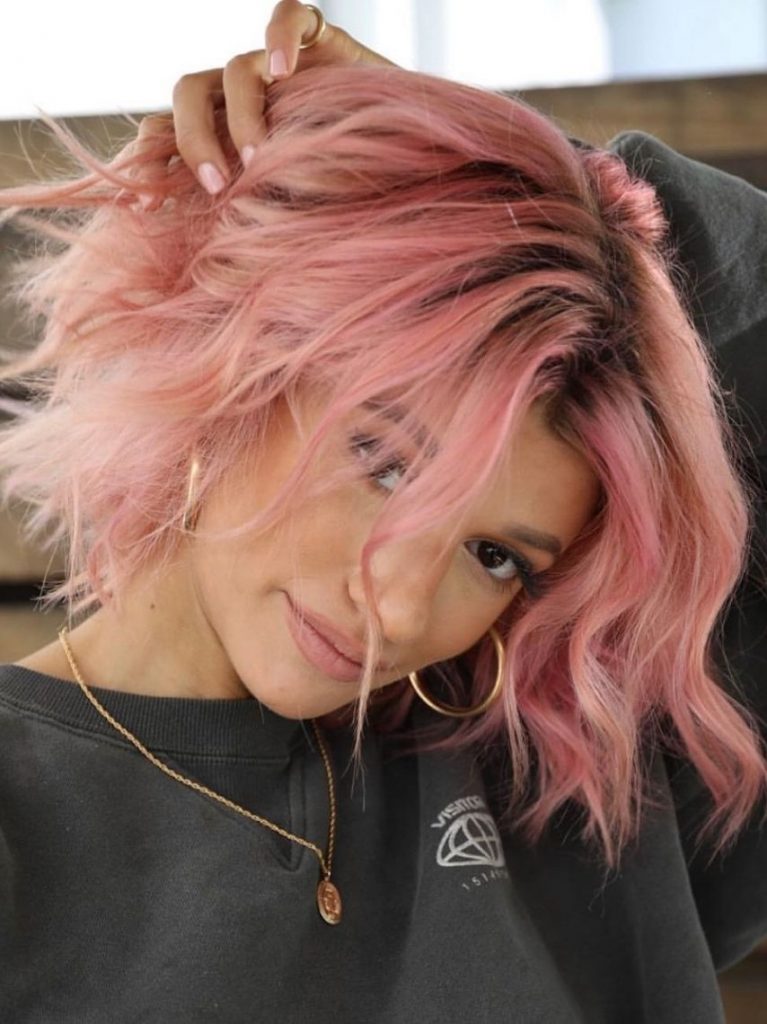 El rosa pastel es un tono suave y moderno que da un toque dulce y juvenil al cabello corto, ideal para morenas que buscan un cambio fresco