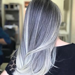 En cabello lacio, el ombré platinado resalta aún más el contraste entre raíces oscuras y puntas claras, logrando un acabado pulido y luminoso