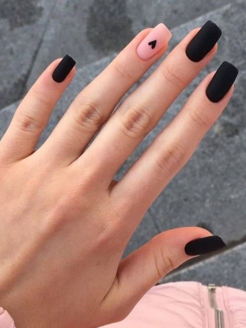 Otra opción para alegrar las uñas negras es dejando una de ellas completamente libre y al natural para dibujar una pequeña figura. Original y simple.
