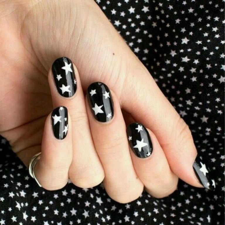 Uñas negras cortas con estrellas blancas, perfectas para un estilo celestial y cómodo