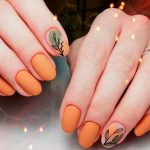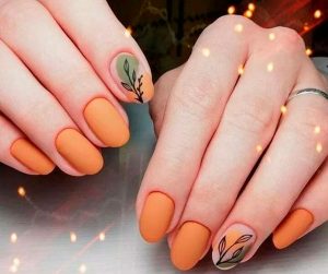 Manicura en acabado mate con base naranja quemada y acentos de hojas en tono verde oliva que aportan un estilo elegante