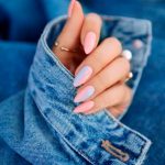 Manicura acrílica estilo stiletto con efecto ombré que fusiona tonos rosa y azul para un look moderno y femenino