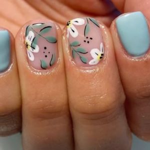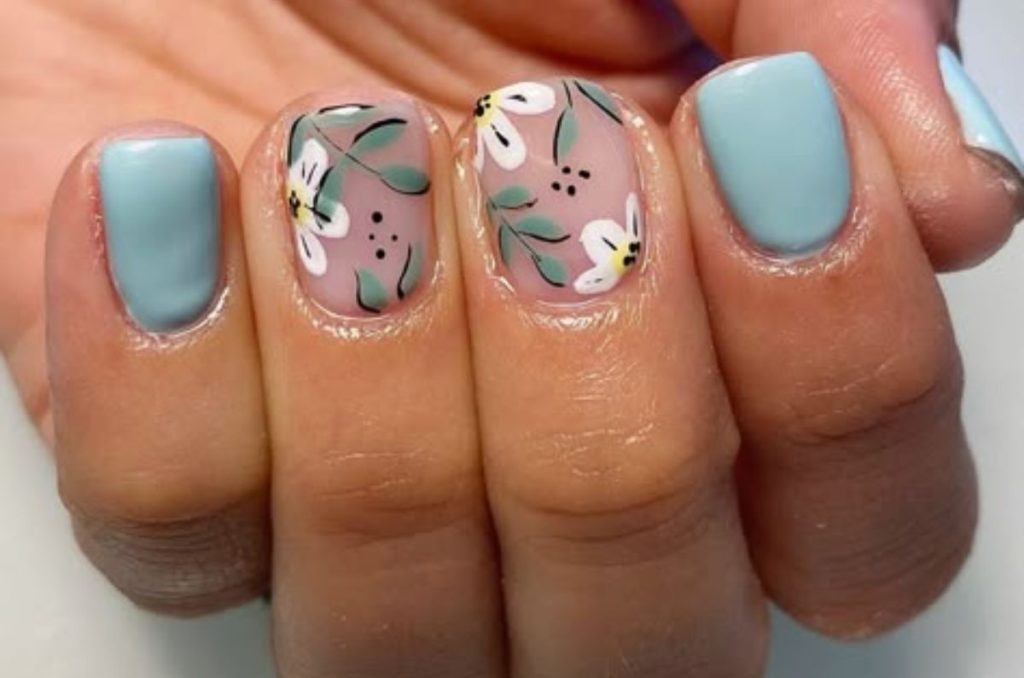 Manicura en tono azul claro con arte floral sutil que refleja delicadeza y estilo en la temporada primaveral