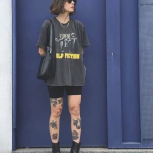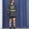 Look urbano compuesto por camiseta gráfica oversize en tono oscuro, biker shorts negros y botas cerradas.