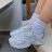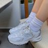 Detalle de tenis deportivos blancos con suela resistente y calcetas altas. Un elemento clave para un outfit cómodo en el 8M, ya que protege los pies, ofrece estabilidad y permite caminar sin molestias.