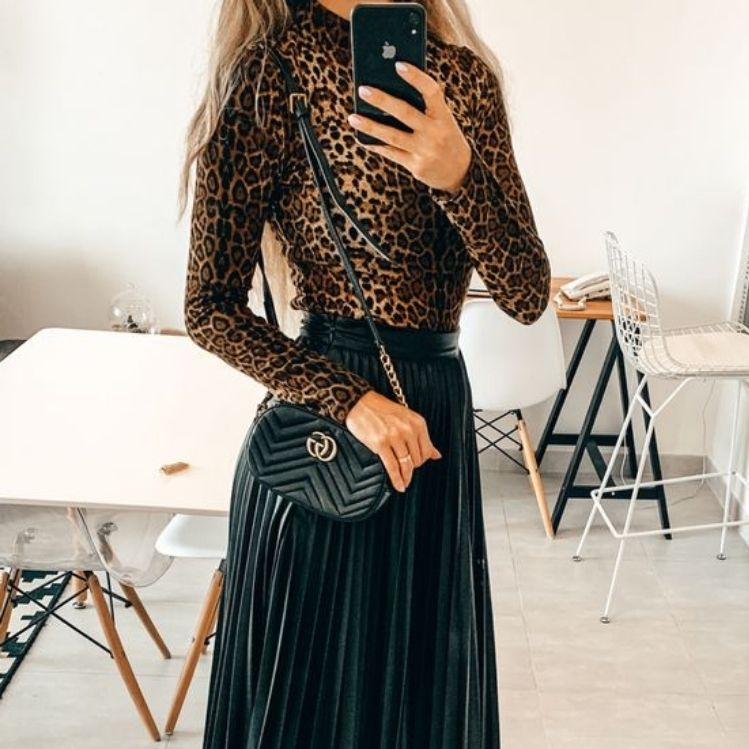 Una gran idea de faldas negras plisadas para ir a la oficina es que armes un atuendo con blusas animal print, se ven muy bien.