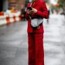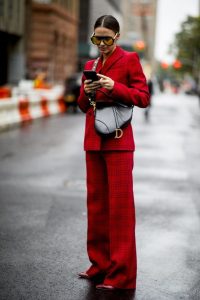 El outfit combina un traje red plaid completamente rojo, mostrando cómo un look monocromático puede ser elegante, moderno y destacar en cualquier cita del 14 de febrero