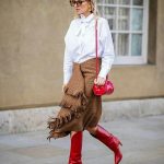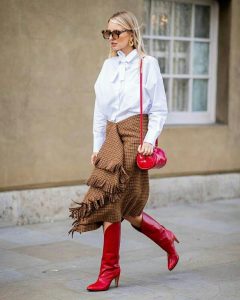 El outfit combina botas largas rojas con una falda y camisa blanca para lograr un equilibrio entre elegancia y modernidad dentro de la nota 10 outfits para enamorar el 14 de febrero