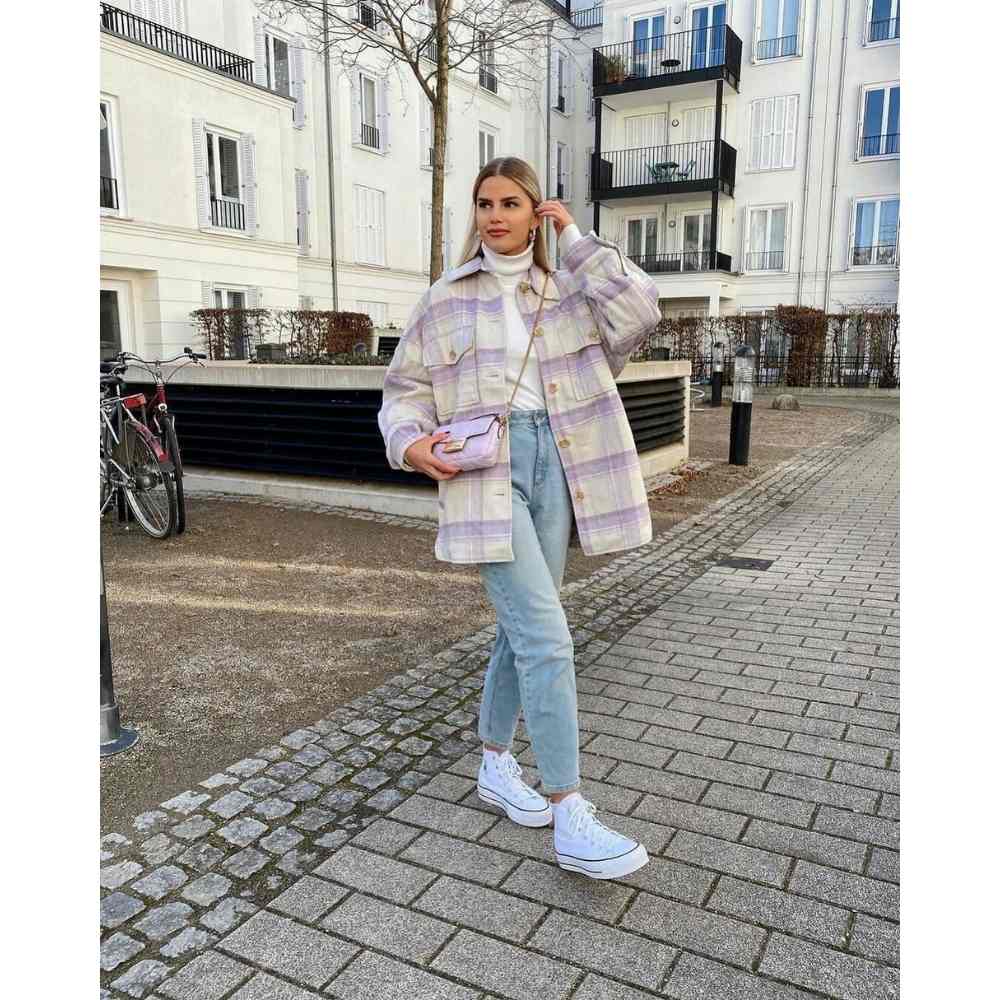 Reinventa el estilo dark academia y apuesta por incluir en tu clóset un precioso abrigo estilo tweed en tonos claros como crema y lila. Esta paleta permitirá que tu look pueda combinarse con todo. Como complemento de esta bella y discreta idea elige un suéter de cuello de tortuga de punto (si no eres tan friolenta prueba con una playera cuello tortuga de manga larga), y tus mejores jeans.