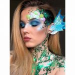 Este maquillaje utiliza tonos iridiscentes y escamas simuladas para crear un look de sirena mágico y fantasioso, ideal para fiestas temáticas o disfraces creativos.