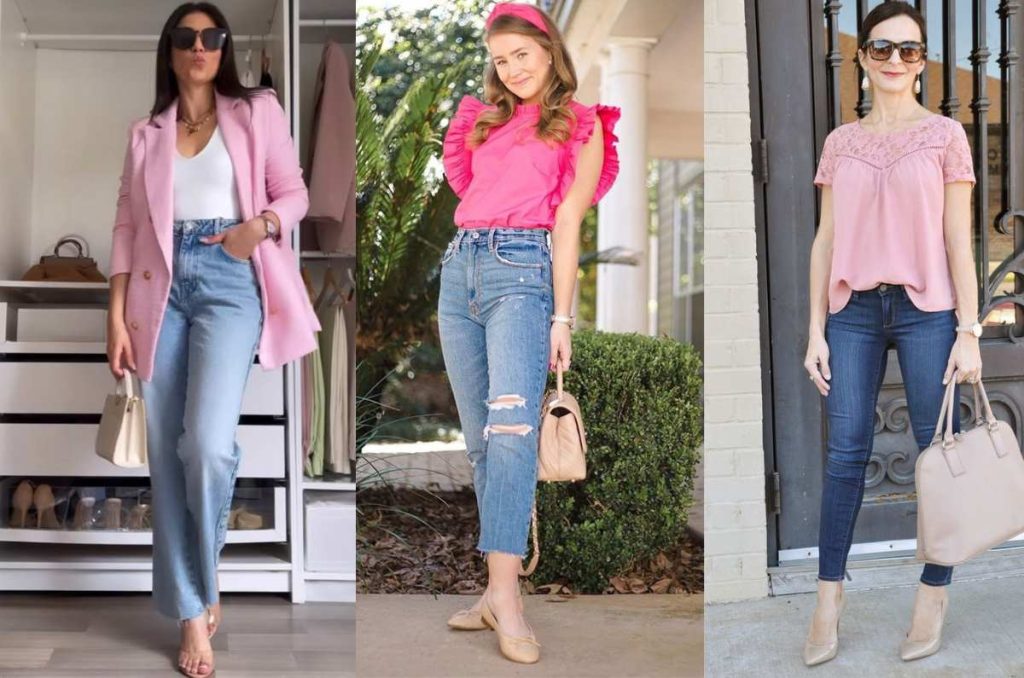 En segundo lugar, te sugiero que lleves los outfits con mezclilla a otro nivel y combina jeans, ya sea skinny, wide leg, anchos, slim, etc. Con un bolso nude y blusa beige o rosa, con este outfit recibirás muchos elogios en la oficina.