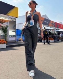 Look monocromático con blusa strapless, pantalones anchos en color gris