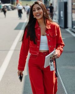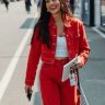 Look monocromático en color rojo de chaqueta y pantalón, u top blanco