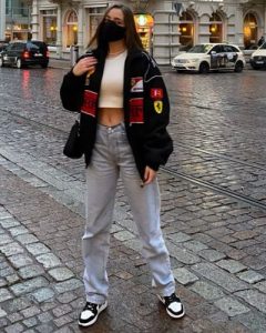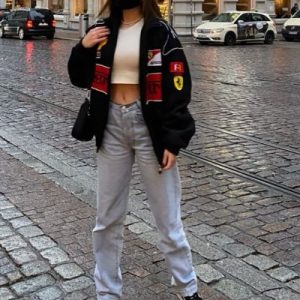 Pantalones wide leg, top blanco y chaqueta de cuero en color negro con detalles de la Fórmula 1