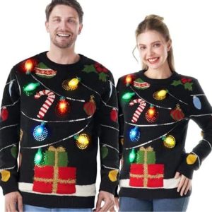 Una pareja combinando ugly sweaters de luces de Navidad, creando un match divertido y lleno de chispa para la temporada
