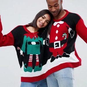 Una pareja combinando ugly sweaters de Santa y su elfo travieso, llevando la diversión navideña al siguiente nivel