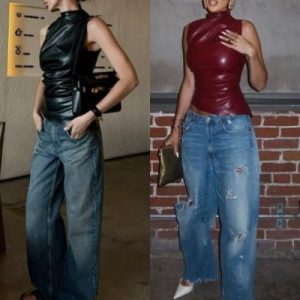 Looks de pantalones baggy y top de cuero