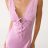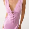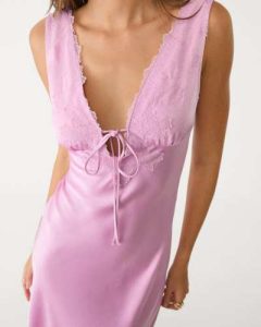 Este close up revela la delicadeza del encaje en el escote y la textura del satén del vestido rosa de Stradivarius, resaltando su elegancia y calidad para cualquier ocasión veraniega