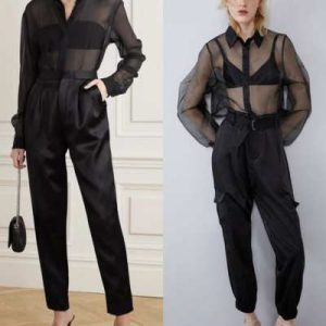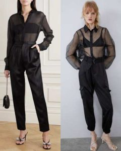 Camisa transparente y pantalones de sastrería, equilibrio entre lo clásico y lo contemporáneo