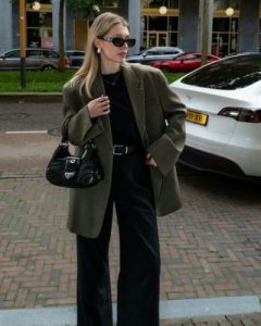 Colores como el verde olivo aportan discreción y combinado con negro conforman un look de oficina elegante