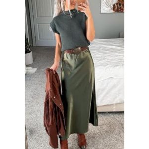 Look en neutros frios. Falda midi en verde oliva y blusa con hombreras y sin mangas en color gris