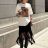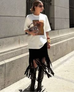 Una falda con flecos en color negro, una camiseta oversize y unas botas largas son perfectas para crear un look boho chic