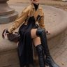 Cropped de cuero en color mostaza, vestido largo de satén en color negro y botas negras altas