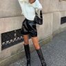 Look con shorts de cuero, sueter blanco de manga larga y calzado de charol