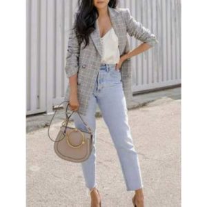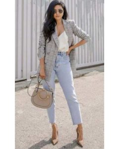 Un look cómodo y profesional que mezcla la silueta relajada de los mom jeans con la sofisticación de un blazer oversized, ideal para oficinas creativas o corporativas.