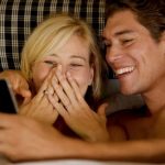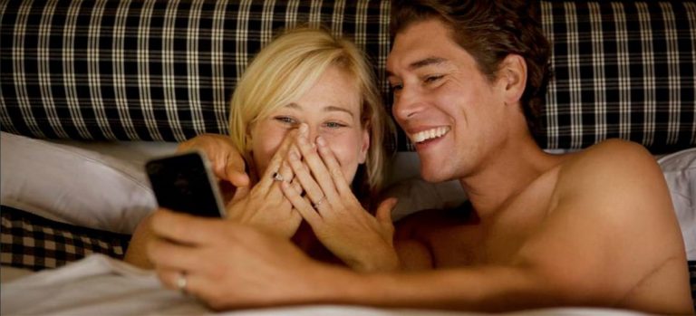 Pareja en la cama compartiendo risas y complicidad, una imagen que refleja cómo disfrutar al máximo los juegos en la intimidad
