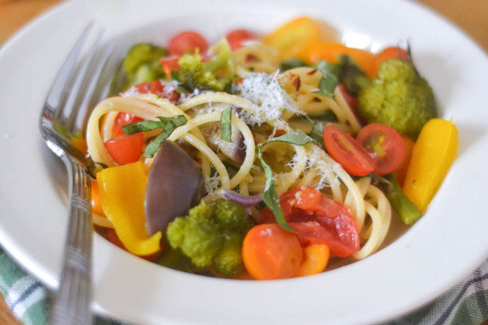 En una olla grande, agrega agua, pasta, y diferentes verduras, pueden ser brócoli, pimiento, espárragos, arúgula, cebolla y calabaza. Pon a hervir todos los ingredientes en agua con sal, pimienta y tres cucharadas de vino blanco. Cuando el agua comience a hervir, tapa la olla y espera 10 minutos hasta que la pasta esté al dente. No vayas a cocer de más la pasta, debe de sobrar un poco de agua pero puedes servir sin necesidad de escurrir. Agrega un poco de queso parmesano y disfruta.