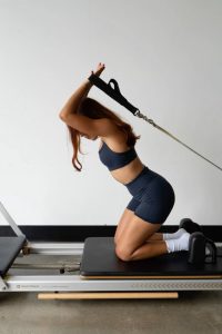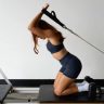 Imagen dividida con cartel de motivación y mujer haciendo ejercicios para brazo