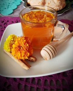 Té de flor de cempasúchil con flores y papel picado como decoración